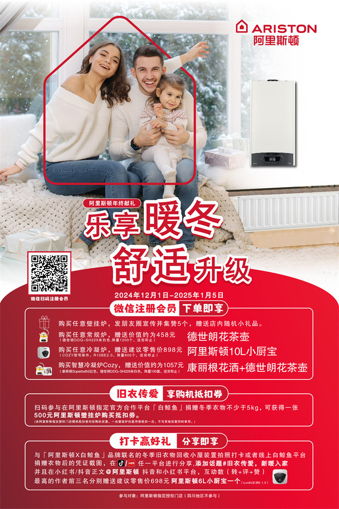 当寒潮来袭,气温逐渐降低,如何在冬日为家庭带来舒适升级的温暖体验成为了许多人关注的话题。趁此岁末之际,意大利供暖热水世家阿里斯顿开启“乐享暖冬,舒适升级”年终献礼促销活动,多重家居好礼下单即送,让高效节能的冷凝壁挂炉走进更多家庭,助力打造温暖宜人的家居空间,守护“一直有温度的家”。